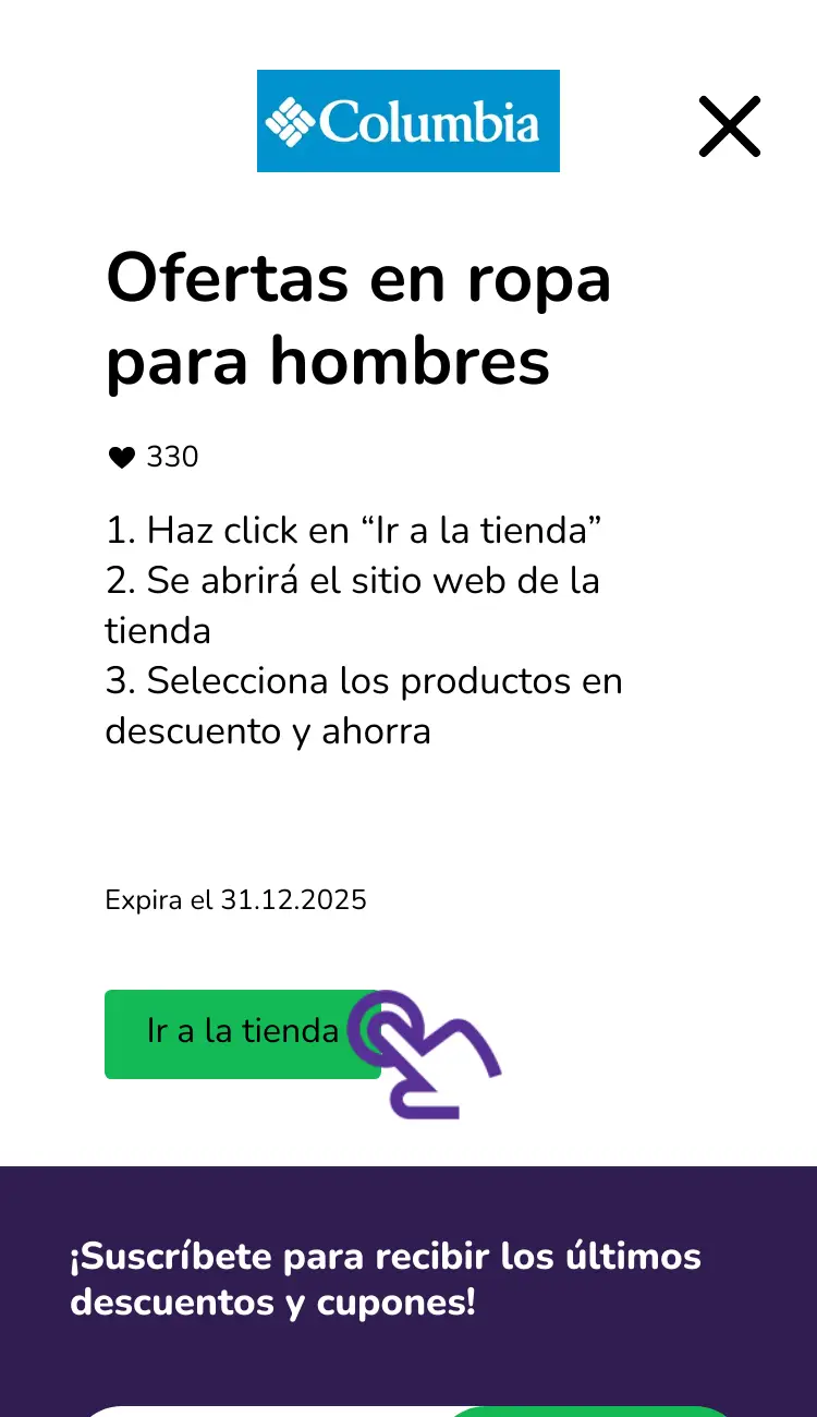 Todos los cupones activos de Columbia están disponibles justo arriba de este texto. Se actualizan con frecuencia y son gratuitos. Solo elige el cupón que prefieras, copia el código y aplícalo durante el proceso de pago en la tienda en línea oficial de Columbia para obtener un descuento directo en tu compra.