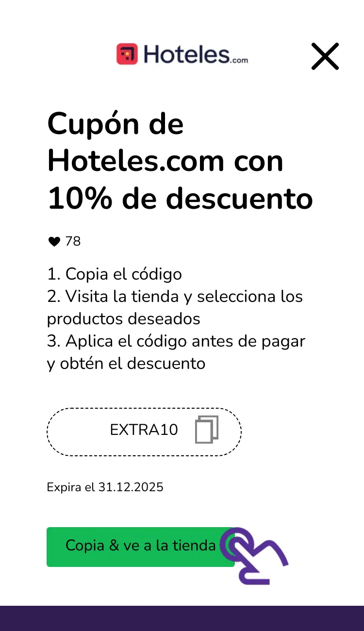Aparecerá una ventana con mayores detalles, como la fecha de expiración del código. Haz clic en “Copia & ve a la tienda” para ser redirigido automáticamente al sitio de Hoteles.com, donde podrás explorar y añadir tus productos favoritos al carrito de compras.
