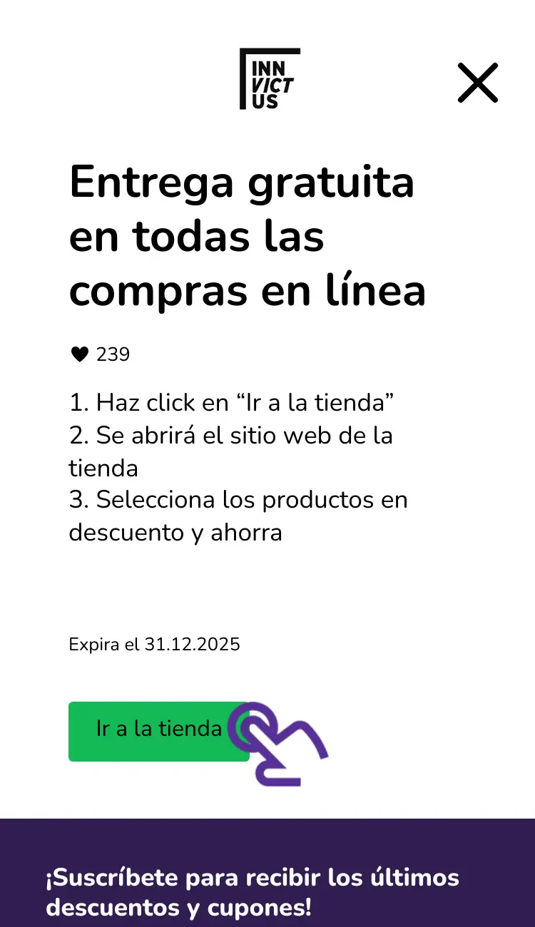 Aparecerá una ventana con mayores detalles, como la fecha de expiración del código. Haz clic en “Copia & ve a la tienda” para ser redirigido automáticamente al sitio de Innvictus, donde podrás explorar y añadir tus productos favoritos al carrito de compras.