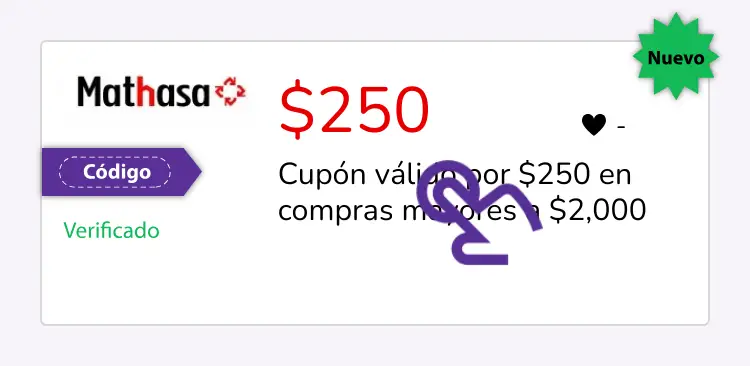 Mathasa ofrece cupones con montos fijos de descuento que se activan al alcanzar un mínimo de compra. Por ejemplo, es posible obtener $150 MXN de descuento en pedidos mayores a $2,000 MXN, o $250 MXN en compras a partir de $4,000 MXN. También existen promociones especiales como boletos de cine gratis en compras superiores a $2,500 MXN. Estas ofertas pueden cambiar según la temporada o la sucursal, por lo que es importante revisar los detalles de cada promoción antes de comprar.